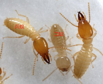 兵蟻是白蟻群體中變化較大的品級,除少數(shù)種類缺兵蟻外,一般從3~4齡幼蟻開始,部分幼蟻分化為色澤較淡的前兵蟻,進而成為兵蟻。