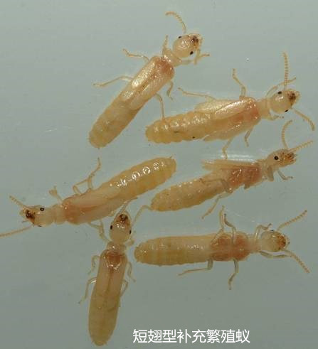補充繁殖蟻有兩類:短翅型(或稱成蟲第二型)和無翅型(或稱成蟲第三型)。此種現(xiàn)象在較高級的白蟻科昆蟲的巢中比較少見。